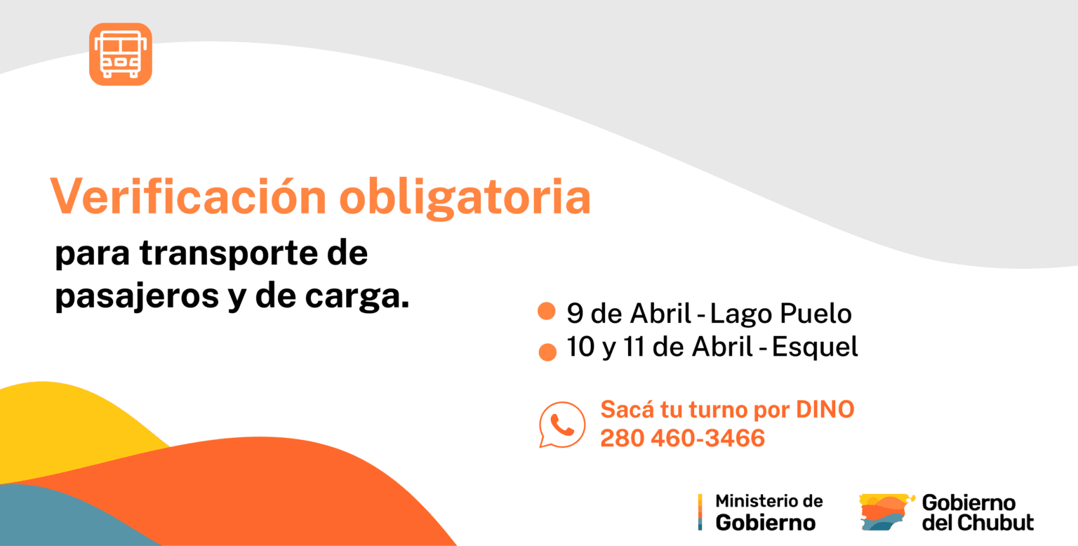 El Gobierno del Chubut, a través de la Subsecretaría de Autotransporte Terrestre, informa que durante el mes de abril se realizarán jornadas de Revisión Técnica Obligatoria (RTO) en la zona cordillerana, destinadas a vehículos de transporte de carga y de pasajeros.
